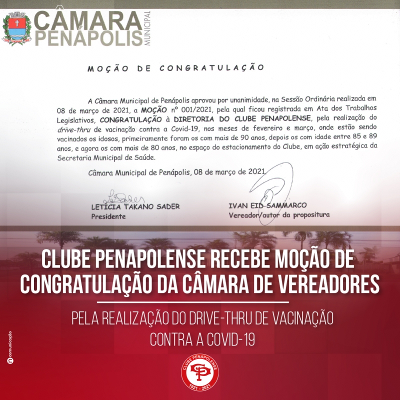 Agradecemos a Câmara Municipal de Penápolis pela Moção de Congratulação ao Clube Penapolense por sediar o Drive-Thru de Vacinação e compartilhamos aqui com vocês o pedido para que continuem fazendo parte do combate: use máscara, evite aglomerações e higienize sempre as mãos. Juntos somos mais fortes!
