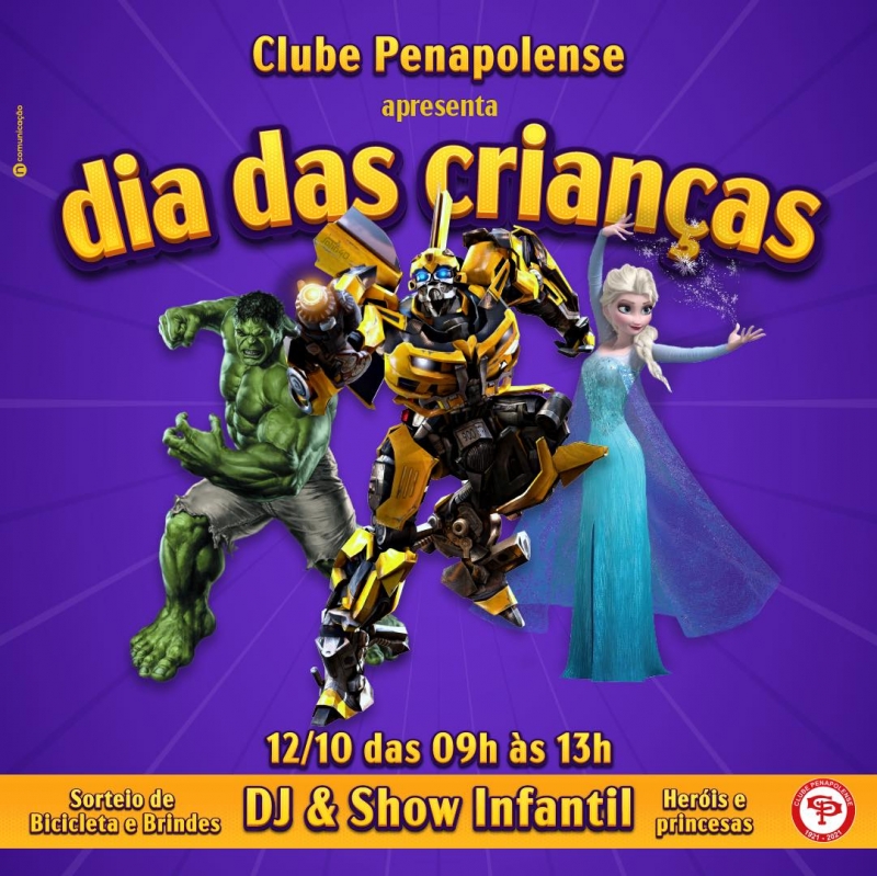 Vem aí o Dia das Crianças do Clube Penapolense. Um dia para celebrar a alegria e a fantasia, com brinquedos, personagens animados e show infantil. Esperamos vocês com deliciosas guloseimas e, claro, sorteio de bicicleta e brindes.