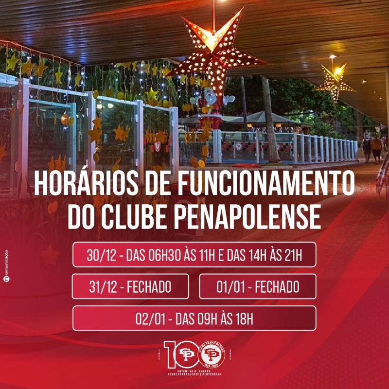Confira os horários de funcionamento do Clube Penapolense nos últimos dias de 2021 e primeiros dias de 2022.