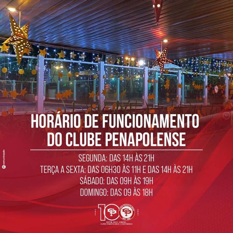 Confira os novos horários de funcionamento do Clube Penapolense durante as férias escolares, nos meses de dezembro e janeiro. Nos dias 20, 24, 25, 30 de dezembro e 1º de janeiro, o CP estará fechado. Informações e solicitações diretamente com a Secretaria pelo (18) 3652-2105, telefone e WhatsApp.